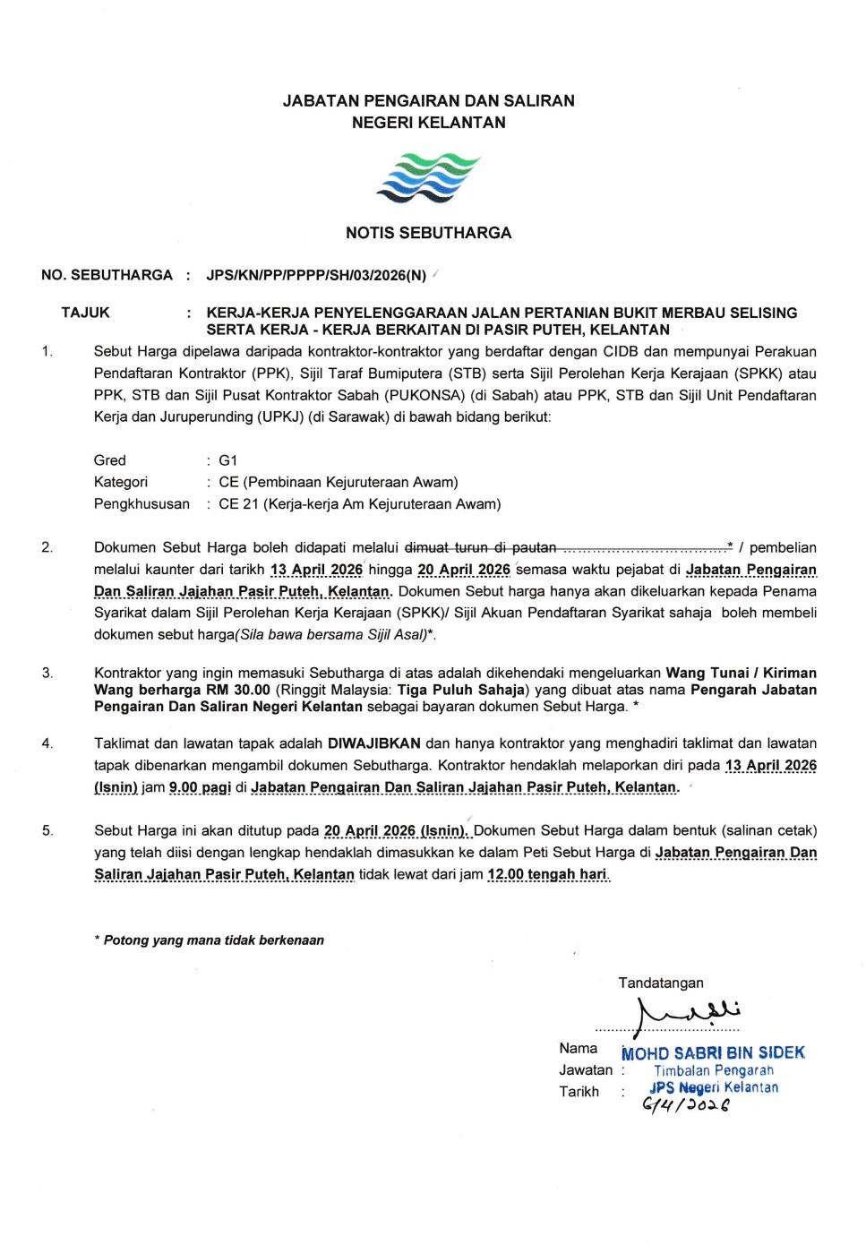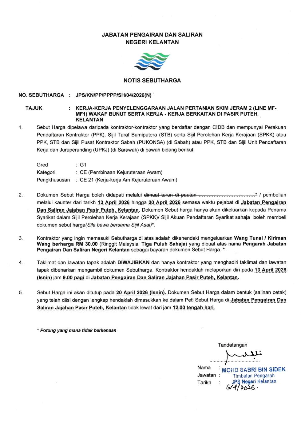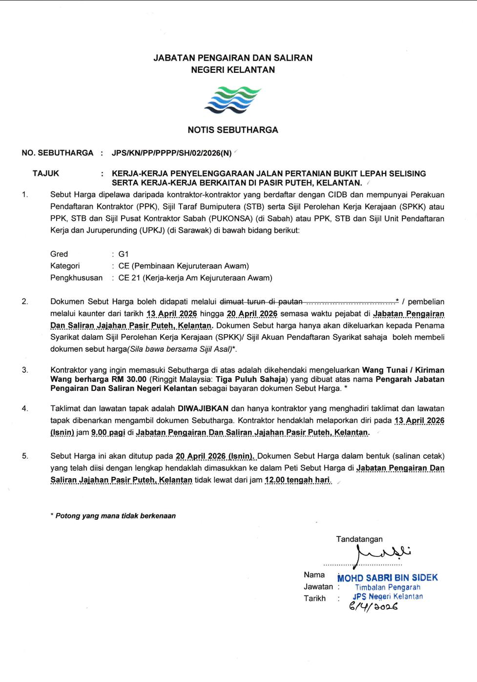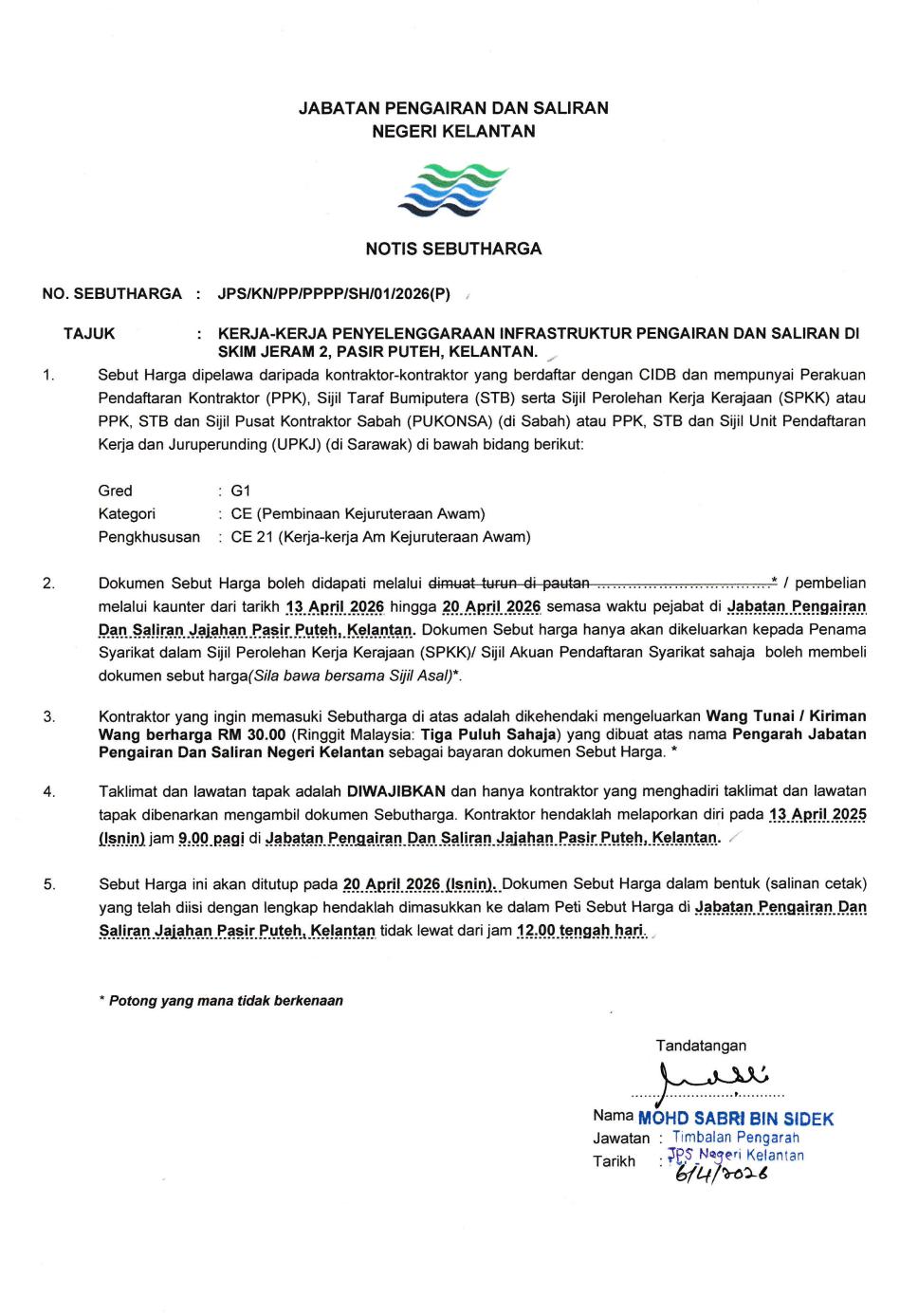 UTAMA PUSAT SUMBER SEBUTHARGA/TENDER/UNDI Iklan JPS/KN/PP/PPPP/SH/01/2026(P), JPS/KN/PP/PPPP/SH/02/2026(N), JPS/KN/PP/PPPP/SH/03/2026(N) & JPS/KN/PP/PPPP/SH/04/2026(N) Mohammad Zulhafiz Zarith Bin Zaini JPS/KN/PP/PPPP/SH/01/2026(P), JPS/KN/PP/PPPP/SH/02/2026(N), JPS/KN/PP/PPPP/SH/03/2026(N) & JPS/KN/PP/PPPP/SH/04/2026(N) Download SH012026P Download SH022026N Download SH032026N Download SH042026N
