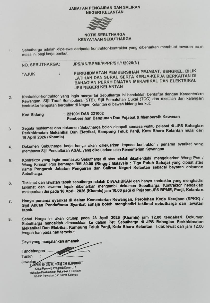 UTAMA PUSAT SUMBER SEBUTHARGA/TENDER/UNDI Iklan PERKHIDMATAN PEMBERSIHAN PEJABAT, BENGKEL, BILIK LATIHAN DAN SURAU SERTA KERJA-KERJA BERKAITAN DI BAHAGIAN PERKHIDMATAN MEKANIKAL DAN ELEKTRIKAL JPS NEGERI KELANTAN BAGI TEMPOH 2 TAHUN Aslam Taslim Bin Idris PERKHIDMATAN PEMBERSIHAN PEJABAT, BENGKEL, BILIK LATIHAN DAN SURAU SERTA KERJA-KERJA BERKAITAN DI BAHAGIAN PERKHIDMATAN MEKANIKAL DAN ELEKTRIKAL JPS NEGERI KELANTAN BAGI TEMPOH 2 TAHUN